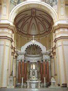 The main areas of the church are the presbytery and the chapel of the reserve altar. Said chapel is located in the end of the right nave. It is a rectangular room, four steps above, which served for much time as the main altar. The presbytery is elevated above the rest of the temple by seven steps; it makes up the main area of the central nave and has a vaulted apse covering it.[4] Inside the presbytery are the altar in a half baldachin, the table of the sacrifice, the seat of the priest, and the ambon, all in marble.