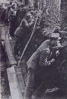 The Polish Legions first arrived in the vicinity of Kostiuchnówka during the advance of the Central Powers in the summer and autumn of 1915, taking Kostiuchnówka on September 27, 1915.[6] That autumn they experienced heavy fighting, with each side trying to take control of the region; a less known battle of Kostiuchnówka took place from November 3 to 10; the Russians managed to make some advances, taking the Polish Hill, but were expelled by the Polish forces on September 10.[4] Polish forces held Kostiuchnówka, and due to their successes in defending their positions, several landmarks in the Kostiuchnówka region became known as "Polish" (called such by Polish as well as by allied German-speaking troops): a key hill overlooking the area became the Polish Hill (Polish: Polska Góra), a nearby forest – the Polish Forest (Polski Lasek), a nearby bridge over the Garbach – the Polish Bridge (Polski Mostek), and the key fortified trench line – Piłsudski's Redoubt (Reduta Piłsudskiego).[6] Polish soldiers built several large wooden camps; the larger of which was known as Legionowo (where the Polish HQ was located).[4] During late autumn, winter and spring no one saw any major moves by either sides, but this changed drastically with the launching of the Brusilov Offensive in June 1916.[6] The Brusilov Offensive would be a major Russian victory, and the greatest of Austro-Hungarian defeats.[7]