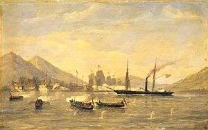 At daylight on 26 February, the three howitzers fired shells and rockets into North Wangtong and occasionally into Anunghoy.[13] British troops were ordered to be ready at 7:00 am,[14] but due to calm weather, the operation was delayed until 11:00 am, when the breeze was strong enough to sail.[15] The fleet began moving into position against the forts on Anunghoy and North Wangtong. In the attack on Anunghoy, Capt. Humphrey Fleming Senhouse of the Blenheim, aided by the Melville, Queen steamer, and four rocket boats,[13] approached the southern fort, dropped its anchor 600 yards (550 m) away, and fired broadsides from its starboard guns. The Melville approached five minutes later off the portside of the Blenheim, sailed within 400 yards (370 m) of the fort, and fired broadsides in quick succession.[16][17] A British officer wrote, "The firing of these ships was most splendid: nothing could withstand their deadly aim ... One or two shot were sufficient for the 'dragon-hearted' defenders of the north fort, who, 'letting' off their guns, fled up the hills."[17] After bombarding and silencing the Anunghoy batteries, Senhouse landed on the southern battery with about 300 marines and men carrying small arms to clear out the few remaining defenders. Within two hours, the Anunghoy forts were seized.[13][18] Chinese Adm. Guan Tianpei was among the estimated 250 killed or wounded in Anunghoy. After his family identified his body the next day, the Blenheim fired a minute-gun salute in his honour as his body was taken away.[19]