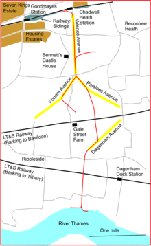 Wills & Sons established a temporary railway, connecting with existing goods sidings at Goodmayes on the Great Eastern Railway main line. Running east to near Chadwell Heath, it then turned broadly south through the future estate, to a 500 feet (150 m) jetty on the Thames, a little to the west of the area known as Horse Shoe Corner. The total distance was somewhat over 3 miles.[3]