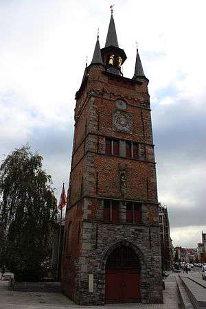 The belfry of Kortrijk, or Belfort in Dutch, is a medieval bell tower in the historical centre of Kortrijk, Belgium. One of the city's most prominent symbols, the belfry formerly housed a treasury and the municipal archives, and served as an observation post for spotting fires and other danger. A narrow, steep staircase, accessible by the public without any entry fee, leads to the top of the building, which nowadays leans about a bit to the west. The Belfry is part of the UNESCO World Heritage since 1999.