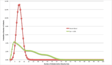 Bespoke portfolios can have very different default correlation characteristics from credit indices with similar distributions of riskiness. Bespoke portfolios almost invariably have numbers of reference securities similar to those of the major credit indices - 100 to 125 reference securities - but bespoke portfolios can include reference securities that have highly correlated default probabilities, either because they are issued by different subsidiaries of the same parent company, because they include closely related but separate companies, or because the bespoke portfolios include much higher concentrations in single industries than occurs in credit indices.[4] Determining the fair default correlations for a bespoke portfolio can be very difficult. The chart on the right shows that differences in correlation can greatly change the probability distribution of defaults and thus change the fair value of any given CDO tranche linked to a particular portfolio.