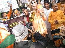 On December 20, 2011, the Vishwa Hindu Parishad (VHP) threatened to protest outside Russian missions in India if Russia effects the ban. VHP General Secretary Pravin Togadia said in a statement that the Bhagavad Gita is held sacred by all Hindus and that its principles have universal appeal and "touch humanity so very deeply", citing Albert Einstein's fascination with the book as an example. Togadia also warned Russian authorities that Indians will be forced to boycott Russian goods, plants, and offices in India in response to the Gita ban in Russia.[71] A group of VHP members held a protest march in front of the Russian consulate in Mumbai.[10] VHP and Bajrang Dal activists also staged protest in Chandigarh, calling on the Indian government to protect the rights of Hindus in Russia and denouncing the proposed ban.[72] On December 23, dozens of activists of Rashtrawadi Sena, a hardline Hindu group, burned a Russian flag and shouted anti-Russian slogans during a protest march in New Delhi over the proposed ban. Rashtrawadi Sena president Jai Bhagwan Goyal called the Gita "the most pious book of the nation" and said there will be no tolerance for insulting it. The protesters also sent a memorandum to Indian President Pratibha Patil, and to the Russian embassy, demanding to avert the ban. They also urged the President to declare the Bhagavad Gita a "national scripture" in order to prevent such insults in the future.[8][73] A similar protest along with the burning of a Russian flag was held on December 26 by activists of the right-wing Hindu organisation Shiv Sena in Amritsar.[8] In a similar move, a Jammu unit of Sri Ram Sena appealed to Indian and Russian authorities to forestall the impeding Gita ban "for the betterment of Indo-Russia relations".[74]