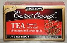 Constant Comment remains today one of Bigelow Inc.'s most popular products. It is a black tea flavored with orange rinds, and sweet spices.[2] The recipe was developed by interior designer Ruth Bigelow in 1945 from an old colonial tea recipe to make orange and spice flavored tea in stone containers.[3]