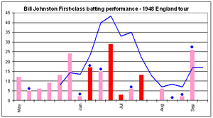 During the tour, Johnston had few opportunities with the bat, invariably batting at either No. 10 and No. 11 alongside Toshack, another tail-ender with little batting ability.N-[1] Neither player ever passed 30 in their first-class career,[102] and they were the only two Australians who failed to pass 50 during the tour.[2] As Australia's other frontline bowlers were Miller, Lindwall, Colin McCool, Ian Johnson and Doug Ring, all of whom scored centuries and more than 20 fifties each during their first-class career,[103] Toshack and Johnston were rooted at the bottom of the batting order. As Australia often won by an innings, and declared in the first innings many time due to their batting strength, Johnston only had 18 innings in his 21 first-class fixtures and scored 188 runs at 18.80, the third lowest average and aggregate. He scored 62 runs in the Tests at 20.66, including his highest first-class score of 29 in the Second Test at Lord’s.[10]