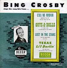 'Bing Crosby Sings the Song Hits from... is a Decca Records album by Bing Crosby featuring songs from recent Broadway musicals issued as a 10” LP issued as catalog No. DL5298 [1] and as a 4-disc 78rpm box set (A-805) and as a 4-disc 45rpm set (9-144).