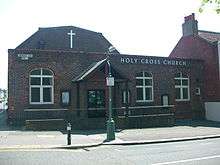 The church became a listed building on 2 November 1992, attaining Grade II status.[4] Its services are evangelical in nature; there is a weekly Communion service on Sunday mornings at 8am, two other services on Sundays at 10am and 6.30pm, a Bible study group (Global Cafe) for non-native English speakers, and various youth groups and children's facilities.[5] The Benefice and parish of Bishop Hannington Memorial Church includes the Holy Cross Church, a small Anglican church which worships in the Conservative Evangelical tradition. This is an older building, dating from 1903, and serves the area around Aldrington railway station. There are services every Sunday, including a Communion service each month, and various groups and events for young people both on Sundays and during the week.[6] The boundaries of the parish are Portland Road (between Bolsover Road and Westbourne Street), Rowan Avenue, Hangleton Road, Nevill Avenue and Hove Park.