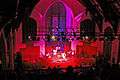 The two-night Blues Masters at the Crossroads seats 450 audience members each night in the original pew and balcony seats. In such an intimate, theater-style setting, the music emanates beneath a 42-foot vaulted ceiling supported by arching walnut beams. Four oak-trimmed stained glass windows at either side of the sanctuary interior gleam from the stage lights. There were 50 windows of varying sizes incorporated into the church design.