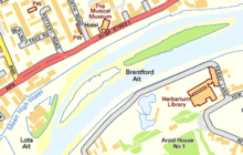 Brentford Ait has a gap in the middle known as Hog Hole which is apparent at lower tides. In the 18th century there was a notorious pub on Brentford Ait called the Swan or Three Swans — its trade was ended in 1796.[1] The Swan Steps lead down to the river at the east end of the long and narrow riverside park, Waterman's Park, at the site of the crossing to this pub. The ait was planted with trees in the 1920s to screen Brentford's gasworks from the view of Kew Gardens. The ait is covered by willows and alder and is a bird sanctuary with a significant heronry. For historic reasons unknown the parish of Kew in Surrey[2] included Brentford in its history; the London Borough of Hounslow administers the neighbouring Lot's Island separated by thick, shifting mud at low tide from Brentford whereas channels on both sides of Brentford Ait are dredged.[3]