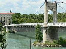 The first bridge, the bridge of the Hôtel-Dieu or Hospital, was built in 18371839 by the contractor Clauzel, on behalf of the company of bridges of the Rhone. This was a suspension bridge with a length of 210 m (689 ft), based on solid concrete piers, protected by riprap.