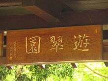The Japan Pond and Garden was re-located from the Japanese Government Pavilion at Brisbane's World Expo '88, and was opened after the conclusion of the Expo on 6 February 1989 through the work of the Brisbane Lord Mayor Sallyanne Atkinson and Nichahiro Hanamura, the chair of the Japan Association for the Expo. A commemorative dedication plaque from Brisbane City Council and the Japan Association for the 1988 Leisure Exposition and a welcome gate with calligraphy on a dedication tablet above the gate by then Prime Minister of Japan Noboru Takeshita greets visitors to the Garden at the entrance to the Garden. The Japanese calligraphy is engraved in gold, dedicating the name of the garden "yu-tsui-en". This literally translates to "enjoy, blue-green, garden" and simply means "Come in to this garden and enjoy the blue of the water and green of the trees".