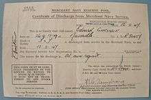 After the foundation of the Ministry of War Transport and the introduction of the Merchant Navy Reserve Pool continuity of employment was ensured and this served as a clearing house for available labour. On leaving a ship a seaman was told how much leave he was entitled to take and on what date and at which port he had to report ready to return to the sea.[25] Some 40 percent of seamen were accepted by companies for "continuous employment" and their time at sea and time on leave were administered by their company.[26] The remaining 60 percent were governed by the "Pool" and retained the right to reject a ship if it did not suit them, and to reject a second ship if that also did not suit them before having no option but to take the third offer. Pools were also set up in Montreal, Quebec, Canada and New York City, USA for seamen resident abroad.[27]