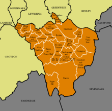 The 22 wards of the London Borough of Bromley (orange) and the surrounding London boroughs (yellow) and districts outside Greater London (grey)