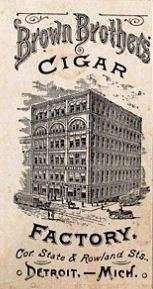 Brown Brothers Tobacco Company , was located at 119 State Street in Detroit. The building was built for brothers, Robert Hamilton Brown and John Brown who founded a cigar manufacturing business which was, at one time, the largest cigar factory under one roof in the world. Brown Brothers were known for the following cigar brands: Newsboys, Cremo, Fontella, Carmencita, Evangeline and Detroit Free Press.[1] [2] [3] [4] [5]