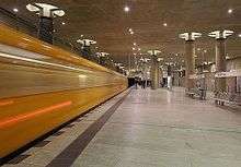 Even though construction was completed in 1994,[1] it took over a decade until the subway line U55 went into service in August 2009.[2] In the intervening period, the partially completed station with its high ceiling and unusual architecture served as a location for cultural events like performances of the opera The Magic Flute and saw use as a film set for the Resident Evil film series,[3] for Æon Flux and for Equilibrium[4]