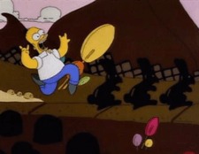 In the original script, the "Land of Chocolate" sequence was absent, though the dialog that set it up was present (Homer complains to his new German bosses about the candy machines not working, to which one of them replies: "We understand, Homer. After all, we are from the land of chocolate!"). Executive producer Sam Simon was the one who suggested that they actually do a sequence in which Homer's mind wanders off into an imaginary land made of chocolate.[3] The sequence was storyboarded by animator Kevin O'Brien, who designed it to be a parody of The Sound of Music, but supervising director David Silverman suggested that it be more original. Silverman storyboarded the revised sequence, and tried to make Homer "deliriously happy" as he skipped through the town.[2] He later recalled, "I animated that scene frame by frame, I needed to draw the skip I wanted. Homer's skipping sets the tone for that show."[9]