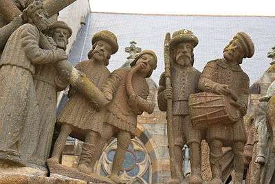 The Calvary of Plougastel-Daoulas in the arrondissement of Brest comprises a raised octagonal pedestal made from the yellow granite of Logonna-Dāaoulas, flanked by four thick arched buttresses. All the sculptural work is by the Maître de Plougastel except the horseman on the left of the crucifix which is by Millet.[1]