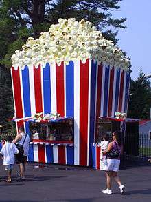 At the front entrance | Bagged popcorn, small bucket of popcorn, large bucket of popcorn, soda, souvenir refill |