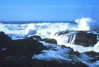 Along the Cape Perpetua coastline, there are several unique features as well. The Devil's Churn is a long crack in the coastal rock that fills with each ocean wave, occasionally exploding as incoming and outgoing waves collide. The Spouting Horn at Cook's Chasm and Thor's Well on the plateau nearby are both salt water fountains driven by the power of the ocean tide. Thor's Well is at 44°16′42″N 124°06′49″W / 44.278421°N 124.113499°W. Spouting Horn is at 44°16′39″N 124°06′47″W / 44.277497°N 124.112994°W. Both Thor's Well and Spouting Horn are best seen approximately an hour before high tide to an hour after high tide. How spectacular the sights are is a function of the height of the high tide and the direction and size of the swells. The wind can also be a factor. Devil's Churn, Spouting Horn and Thor's Well are popular with visitors; however, all three can be dangerous especially at high tide and during winter storms.[1]