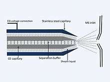 Capillary electrophoresis–mass spectrometry (CE-MS) is an analytical chemistry technique formed by the combination of the liquid separation process of capillary electrophoresis with mass spectrometry.[1] CE-MS combines advantages of both CE and MS to provide high separation efficiency and molecular mass information in a single analysis.[2] It has high resolving power and sensitivity, requires minimal volume and can analyze at high speed. Ions are typically formed by electrospray ionization,[3] but they can also be formed by matrix-assisted laser desorption/ionization[4] or other ionization techniques. It has applications in basic research in proteomics[5] and quantitative analysis of biomolecules[6] as well as in clinical medicine.[7][8]