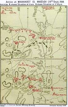 Units of the 4th Cavalry Division continued the advance southwards from Beisan on 24 September, after rations had been distributed. At 10:35 an observation post sighted a column of Ottoman soldiers making for a ford across the Jordan River at Makhadet el Mas'udi, where the Ottoman advanced guard arrived and deployed its machine guns to cover the escape of a larger body of Ottoman troops across another ford 1 mile (1.6 km) further south.[Note 11] (See Falls Sketch Map 36 Detail 'A' Situation at 11:00) The 1/1st County of London (Middlesex) Yeomanry attack at Makhadet el Mas'udi ford succeeded at 12:30, while the 29th Lancers reinforced the Yeomanry attack on the main column, capturing a total of 5,000 prisoners, including an Ottoman divisional commander, with many dead.[73][74]