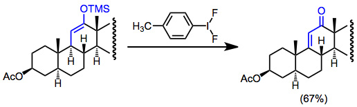In some cases, rearrangements complicate hypervalent iodine oxidations of carbonyl compounds. Aryl migration may occur under acidic conditions, yielding α-aryl esters from enol ethers.[7] Favorskii rearrangements have also been observed, and these have been particularly useful for steroid synthesis.[16]