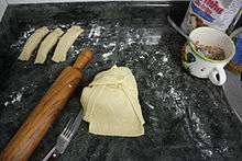 The Casadiella is a typical dessert from Asturias. It consists of a pastry made of wheat flour, flavored with Anis del Mono (Anisette) or wine, and filled with toasted hazelnuts or walnuts and sugar. They are mixed and they are fried together.[1]