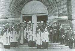 The Catholics, in the meantime, were worshipping in the Church of St. Michael and St. Sebastian which had been erected in 1855 opposite the Louise Margaret Hospital. This church was a large wooden building not unlike a barn in appearance, and was constructed mainly of cast iron with internal wooden pillars. The nave had many windows filled with stained glass.[6][7]
