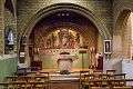 The ornate east end, with a rich 1930s mosaic on the reredos portraying the Last Supper, contrasts with the simplicity of the rest of the chancel, which was reordered to provide room for a free-standing plain altar. The East Window over the altar is dedicated to the men of the Royal Army Service Corps who lost their lives during the Boer War of 1899-1902. Tablets in the Sanctuary commemorate the 376 men who died. The window depicts The Ascension, The Translation of Elijah, The Crucifixion, Moses and the brazen serpent and Samson carrying off the Gates of Gaza. The memorial to those who fell in World War I consists of the mural decorations in the Sanctuary and Chancel.