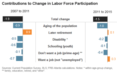 Economists at the Federal Reserve Bank of Atlanta reported in April 2016 that changes in the labor force participation rate reflect both aging (demographic) and behavioral aspects. They estimated the demographic effect was responsible for about half the 3.4 percentage point decline between 2007-2015. However, the behaviors contributing to the remainder changed when measuring components of the 1.9 percentage point decline from 2007-2011 and the 1.5 percentage point decline from 2011-2015. Those persons wanting a job (who were still considered outside the workforce due to not actively searching for employment) contributed 0.7 percentage points to the decline 2007-2011, but actually offset the decline from 2011-2015, indicating improving labor market conditions. From 2007-2015, later retirement was another factor offsetting the decline, while disability, more youth in school, and prime age workers not wanting a job contributed to the decline.[23]
