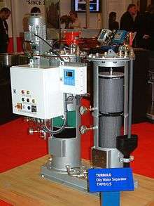 A centrifugal water–oil separator, centrifugal oil–water separator or centrifugal liquid–liquid separator is a device designed to separate oil and water by centrifugation. It generally contains a cylindrical container that rotates inside a larger stationary container. The denser liquid, usually water, accumulates at the periphery of the rotating container and is collected from the side of the device, whereas the less dense liquid, usually oil, accumulates at the rotation axis and is collected from the centre.[1]