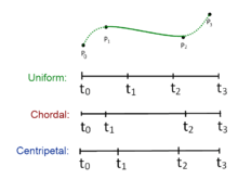 In computer graphics, centripetal Catmull–Rom spline is a variant form of Catmull-Rom spline [1] formulated by Edwin Catmull and Raphael Rom according to the work of Barry and Goldman.[2] It is a type of interpolating spline (a curve that goes through its control points) defined by four control points , with the curve drawn only from to .