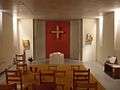 Since the church has lost its full original height, new windows by the Viennese artist Thomas Reinhold were inserted.[3] The side windows show the themes of Creation, Incarnation, the Burning Bush and Pentecost, whereas the window of the main façade represents the Resurrection. They windows produced by the factory of the Schlierbach convent in Upper Austria and financed by nine Austrian regions. On a side gallery, the chapel has an organ from the workshop Etienne Debaisieux,[4] the instrument being a gift by the Evangelical Church in Germany (EKD). In the floor above, the building accommodates a meeting hall and office rooms (not visible from outside).