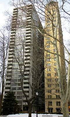 The 27-story building was designed by architect Horace Trumbauer in the Lombardic Romanesque style and completed in 1928. The style was perhaps suggested by the newly built Shelton Hotel in New York City, designed by A. L. Harmon.[2] There are setbacks on the 17th and 24th floors.[3]