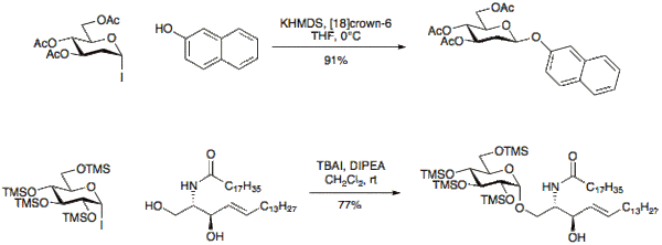 Iodide donors may typically be activated under basic conditions to give β-glycosides with good selectivity. The use of tetraalkylammonium iodide salts such as tetrabutylammonium iodide (TBAI) allows for in-situ anomerization of the α-glycosyl halide to the β-glycosyl halide and provides the α-glycoside in good selectivity.[11][12][13][14]