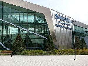 Cheongna International City (Hangul: 청라국제도시역; Hanja: 靑羅國際都市驛) is a station of the AREX in Gyeongseo-dong, Seo District, Incheon, South Korea. It is situated near the entrance of the Incheon International Airport Expressway. It has an unusual design, the first building is built for access to the station, and the second building which houses the platforms, is connected to the first building with a skybridge.