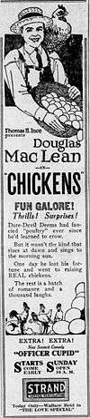Chickens is a 1921 American silent comedy drama film directed by Jack Nelson and written by Agnes Christine Johnston based on the story "Yanconna Yillies" by Herschel S. Hall. The film stars Douglas MacLean, Gladys George, Claire McDowell, Charles Hill Mailes, Raymond Cannon, and Willis Marks. The film was released on February 13, 1921, by Paramount Pictures.[1][2] It is not known whether the film currently survives.[2]