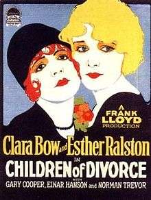 Children of Divorce is a 1927 American silent romantic drama film directed by Frank Lloyd and starring Clara Bow, Esther Ralston, and Gary Cooper. Adapted from the 1927 novel of the same name by Owen Johnson, and written by Louis D. Lighton, Hope Loring, Alfred Hustwick, and Adela Rogers St. Johns, the film is about a young flapper who tricks her wealthy friend into marrying her during a night of drunken revelry. Even though she knows that he is in love with another woman, she refuses to grant him a divorce and repeat the mistake of her divorced parents. Produced by Jesse L. Lasky, E. Lloyd Sheldon, and Adolph Zukor for the Famous Players-Lasky, the film was released on April 25, 1927 by Paramount Pictures.[1]
