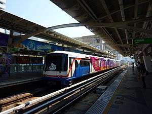 Chit Lom station (Thai: สถานีชิดลม) is a BTS skytrain station, on the Sukhumvit Line in Pathum Wan District, Bangkok, Thailand. The station is located on Phloen Chit Road at Chit Lom intersection to Lang Suan and Chit Lom Road. It is also linked by Skybridge directly to Central Chidlom department store, and Sky Walk to Ratchaprasong intersection where Central World, Gaysorn Plaza and Erawan Shrine is situated next to Pratunam clothing market within walking distance from the intersection. The Sky Walk also links the station with Siam Station, with cluster of luxury shops in Siam Square and Siam Paragon shopping mall.