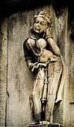 The exterior walls of the temple are covered with erotic couples, surasundari, and various gods, including an 11-headed Vishnu.[3] The Vishnu sculpture shows the god in his para rupa (supreme form) with his 10 incarnations: this rare representation is not seen anywhere else, and does not find a mention in any historical text.[6] Other sculptures include figures of couples engaged in mithuna, and the apsaras showing their yoni by holding their garments lower.[5] There is also a sculpture of Shiva's attendant Nandi, who is shown with a human body and a bull's head.[7]