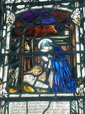 | Fourth and final tier of five lights | Scenes from the lives of the five Saints shown above. | These depict events which are associated with each of these five saints. For St Columba, Whall chose to depict Columba with a stork, reminding us that Columba had to suffer exile from Ireland and would have missed his homeland and for St Aidan, he depicts the shield of the first Church of Wattles on Lindisfarne with the motto "Simile est grano sinapis" / "It is like a grain of mustard seed", thus reminding us that Aidan was to help sow " the seed of Northern Christianity" (mustard was grown on Lindisfarne). For Hilda, Whall depicts St Aidan visiting St. Hilda’s school and for Cuthbert we have the motto "Et factus in arborem magnam" /"It becomes a great tree (Gloucester Cathedral)". Finally Whall depicts Chad placing his Bishopric at the disposal of Theodore. The window is in memory of John Dearman Birchall (1828–1897) of Bowden Hall near Gloucester and was given by his son.[2][3] |