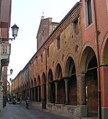 The church is part of a huge complex with the convent on the left, and the hospital, on the right. A connection between the various functions is the long porch on the street, with thirty-seven arches with terracotta decorations; those corresponding to the church and convent are twenty-six and supported by columns. The portico, vaulted and decorated by the stories of St. Francis in "Verdeterra" (sort of grisaille) work of Francesco Squarcione executed between 1452 and 1466.[1] Overtime it has deteriorated. By the middle of the eighteenth century the friars decided to cover it in white. Today, most of the figures are gone. In May 2014 it was proposed for restoration of the pictorial decoration.