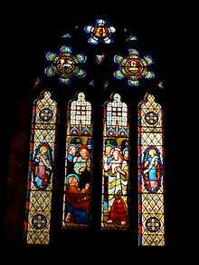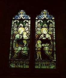 The two-light window at the east end of the north aisle represents Mary and Martha of Bethany, mentioned in Luke 38–42. In that story, Mary is interested in spiritual matters, whereas Martha prefers to do practical work. Thus Martha has a housekeeper's attributes of a spinning wheel and a purse at her waist, while Mary is praying and reading the Scriptures. This window is dedicated to Ann Mitchell, the village postmistress, by her husband.[15][23] The three-light window on the north aisle carries the theme of evangelism and music. It shows King David in the centre light, playing music. The left-hand light carries the words, "Their sound is gone out unto all lands," and the right-hand light says "and their words into the ends of the world." This is a translation of the 4th and 5th lines of Psalm 19, as it appears in the Book of Common Prayer: day 4, morning prayer. The men on either side of David are both saints with halos, and churchmen, wearing mitres. The dedication for this window is missing, but it was said by a local newspaper to have been given by William Clapham Cautley,[1] and that it is dedicated to George Thomas Woods of the Order of Saint John. Woods was church organist for 24 years.[15][23]