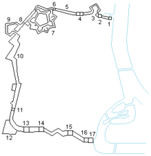 1. Porte Maghin, 2. Porte Saint-Léonard, 3. Bastion Saint-Léonard, 4. Porte de Vivegnis, 5. Rempart des Six-Cents-Degrés, 6. Païenporte, 7. Citadel, 8. Porte Sainte-Walburge, 9. Bastion du Clergé, 10. Bastion des Anglais, 11. Hocheporte, 12. Bastion du Saint-Esprit, 13. Porte Sainte-Marguerite, 14. Porte Saint-Martin, 15. Tour des Moxhons, 16. Porte des Bégards, 17. Tour des Bégards.