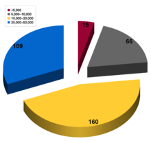 Although not every small city is designated as a city of district significance, in 2003 there were a total of 305 such small cities, which is 3/4 of the total number of cities in Ukraine, and 13% of the total population (19% of the urban population).[7] In 2003, 15 cities had a population of up to 5,000; 66 cities had populations between 5,000–10,000; 160 cities had populations between 10,000–20,000; 109 cities had populations between 20,000–50,000.[7]