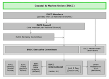 The Executive Committee is responsible for the management of matters of a strategic nature and provides guidance to the international office in Leiden. The international office provides services to the national branches and encourages and leads join initiatives. EUCC counts with a regional office for the Mediterranean Sea, the EUCC Mediterranean Centre in Barcelona, Spain. This office represents a separate legal entity under Spanish law, and it is managed by its own Board. . There are national branches in the following 13 countries: Belgium, Denmark, France (EUCC-France Le Réseau Européen des Littoraux), Germany (EUCC – The Coastal Union Germany), Italy, Lithuania, Malta, Netherlands, Poland, Portugal, Spain, Ukraine and United Kingdom. Not all branches are active. Furthermore, EUCC Council established an Advisory Board in 2004 which assists the EUCC Executive Committee, International Offices and National Branches in the development of EUCC policies and projects on the basis of their expertise and experience.