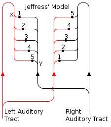 Coincidence detection has been shown to be a major factor in sound localization along the azimuth plane in several organisms. In 1948, Lloyd A. Jeffress proposed that some organisms may have a collection of neurons that receive auditory input from each ear.[2] The neural pathways to these neurons are called delay lines. Jeffress claimed that the neurons that the delay lines link act as coincidence detectors by firing maximally when receiving simultaneous inputs from both ears. When a sound is heard, sound waves may reach the ears at different times. This is referred to as the interaural time difference (ITD). Due to differing lengths and a finite conduction speed within the axons of the delay lines, different coincidence detector neurons will fire when sound comes from different positions along the azimuth. Jeffress' model proposes that two signals even from an asynchronous arrival of sound in the cochlea of each ear will converge synchronously on a coincidence detector in the auditory cortex based on the magnitude of the ITD (Fig. 2). Therefore, the ITD should correspond to an anatomical map that can be found within the brain. Masakazu Konishi's study on barn owls shows that this is true.[3] Sensory information from the hair cells of the ears travels to the ipsilateral nucleus magnocellularis. From here, the signals project ipsilaterally and contralaterally to two nucleus laminari. Each nucleus laminaris contains coincidence detectors that receive auditory input from the left and the right ear. Since the ipsilateral axons enter the nucleus laminaris dorsally while the contralateral axons enter ventrally, sounds from various positions along the azimuth correspond directly to stimulation of different depths of the nucleus laminaris. From this information, a neural map of auditory space was formed. The function of the nucleus laminaris parallels that of the medial superior olive in mammals.[4]