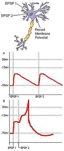 Fig. 1: Two EPSP's innervated in rapid succession sum to produce a larger EPSP or even an action potential in the postsynaptic cell.