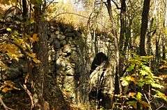 The County Farm Bridge is a historic stone arch bridge in Wilton, New Hampshire. Built in 1885, it carries Old County Farm over Whiting Brook, just south of its northern junction with Burton Highway in a rural section of northwestern Wilton. Old County Farm Road was the main access road to the Hillsborough County Poor Farm, and is now an unmaintained class 6 road. The bridge consists of a single stone arch with a span just under 18 feet (5.5 m). It is lined with cut granite voussoirs which were quarried in Wilton. The arch begins on land 7 feet (2.1 m) above the water, and the arch rises to a height of 15'10" above the typical water level. The arch is embedded in a causeway which is 430 feet (130 m) long.[2]
