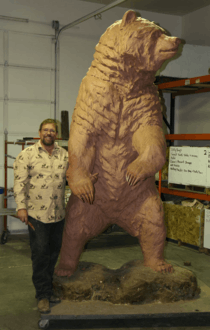 Parker in 2008 standing near his Something's Coming grizzly bear sculpture in clay